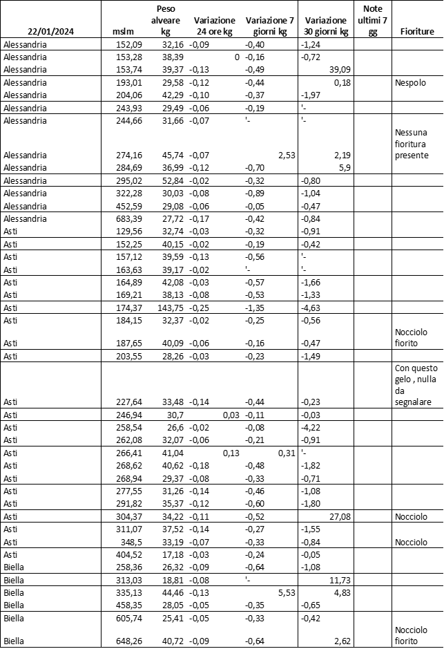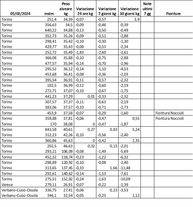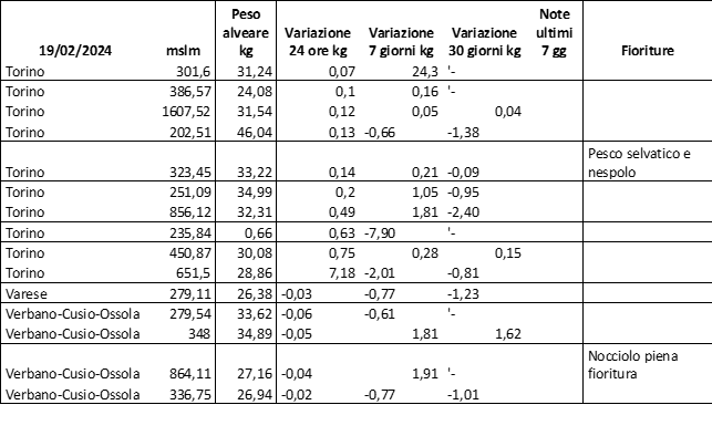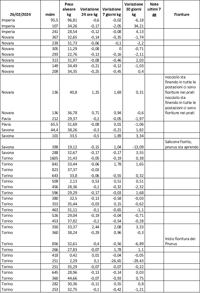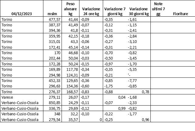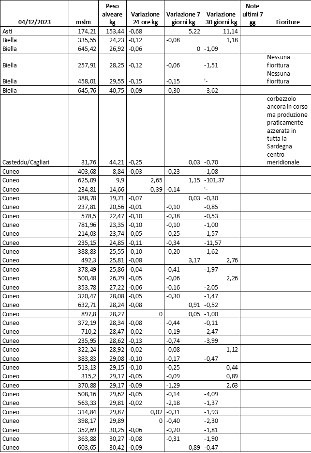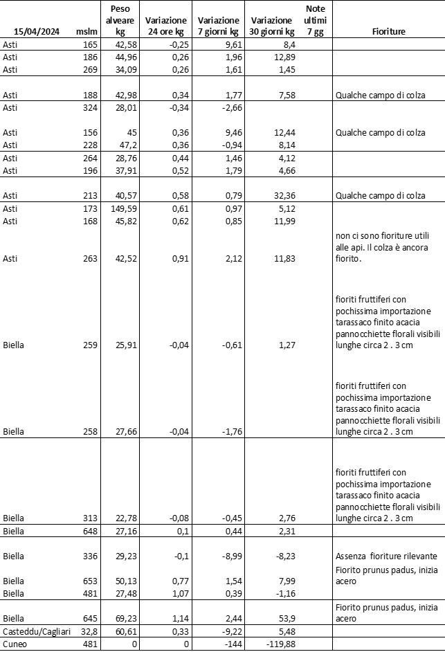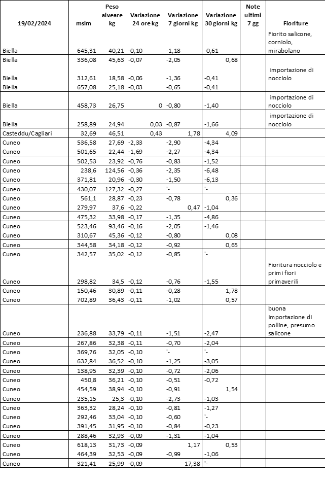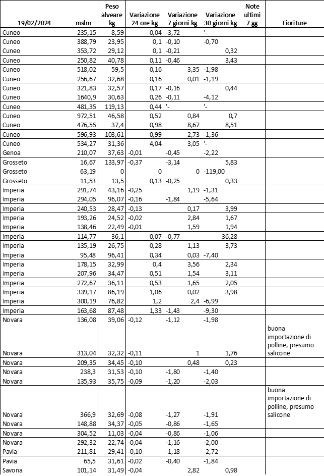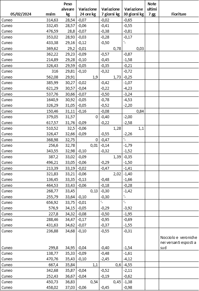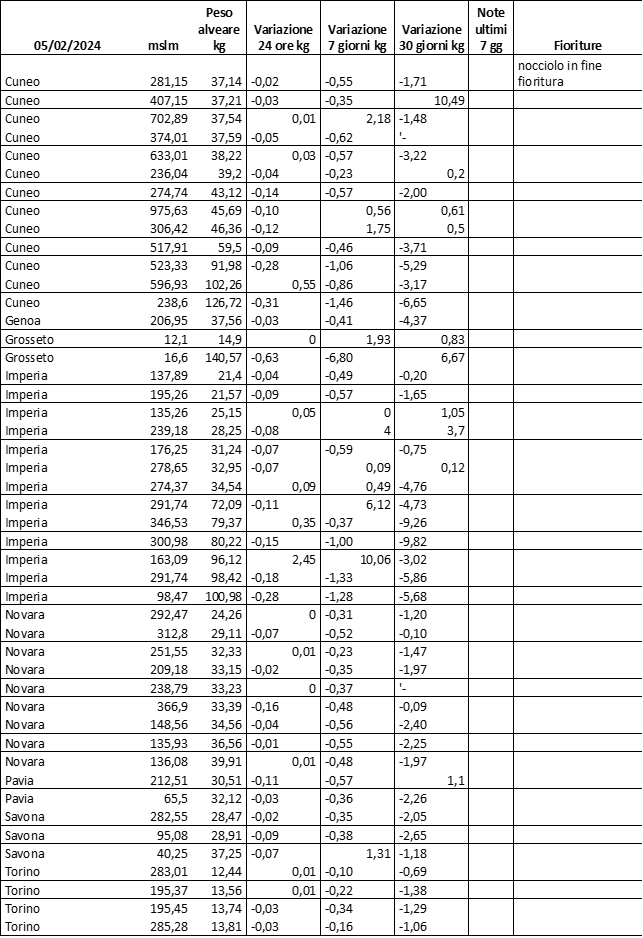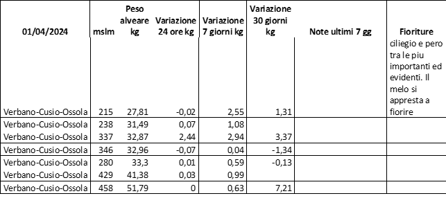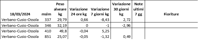 E’ prevista una comunicazione periodica a livello provinciale e altimetrica dei raccolti/consumi degli alveari.