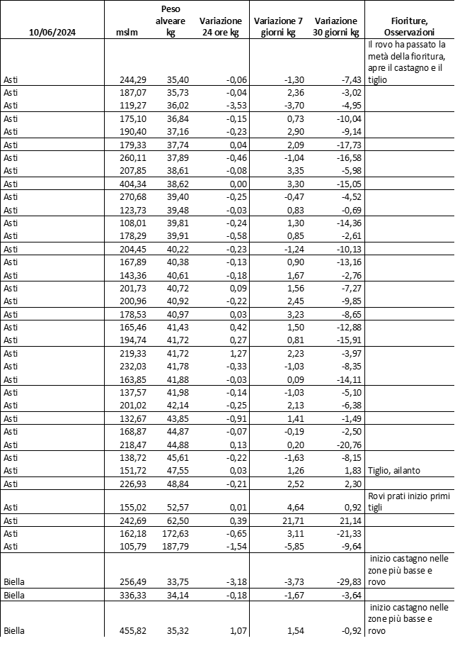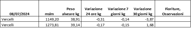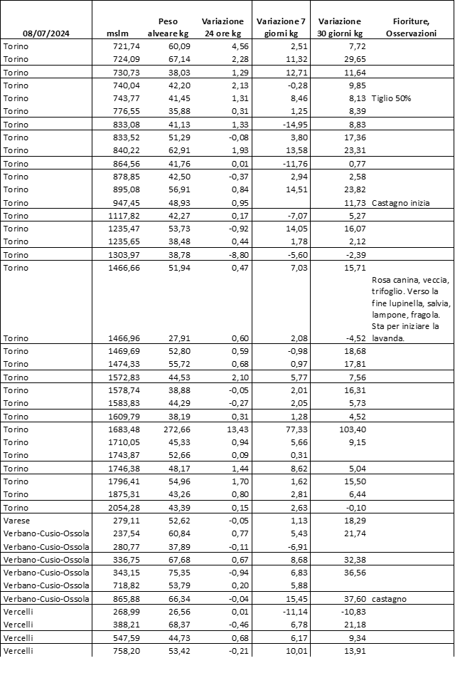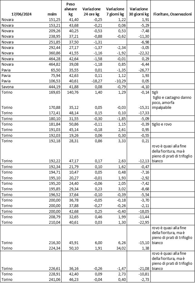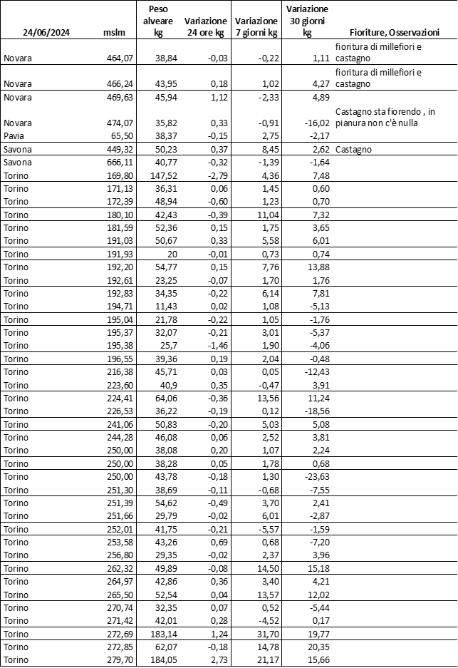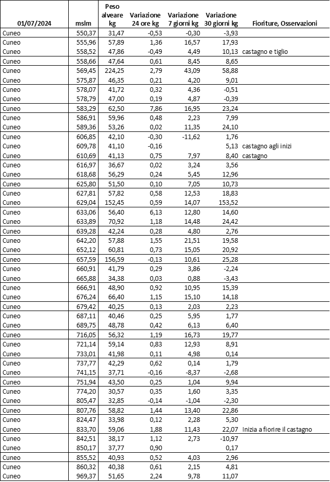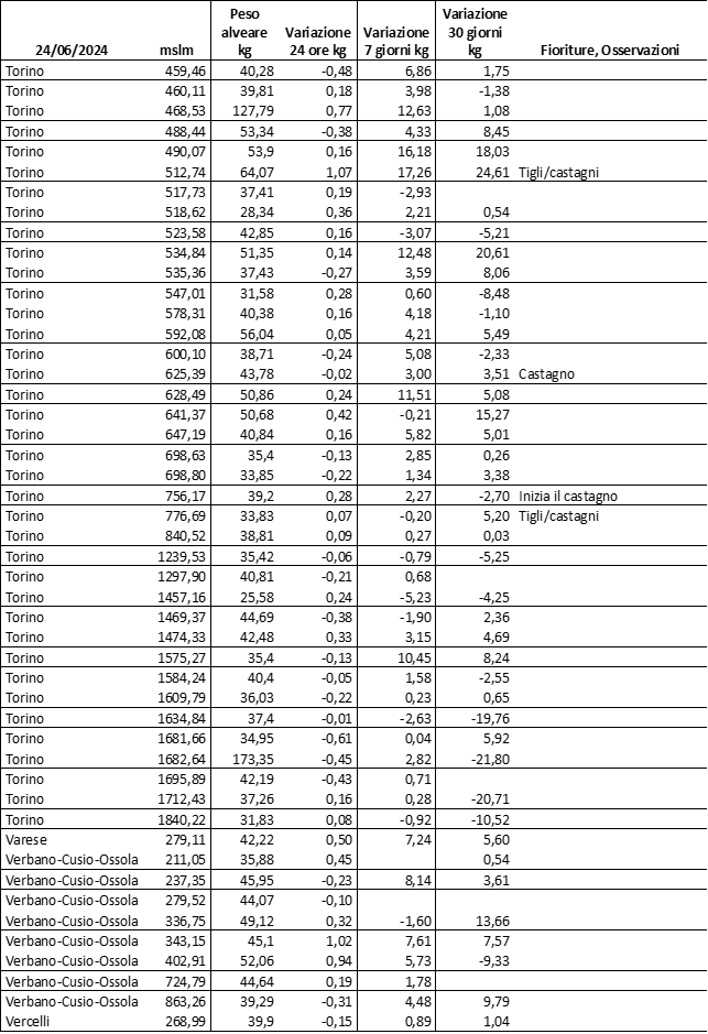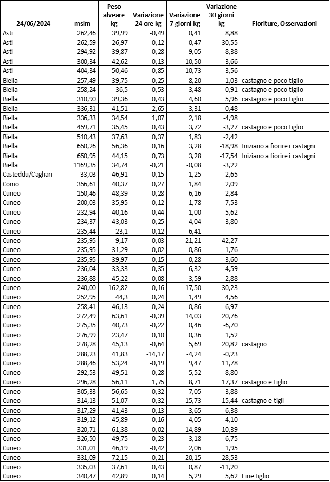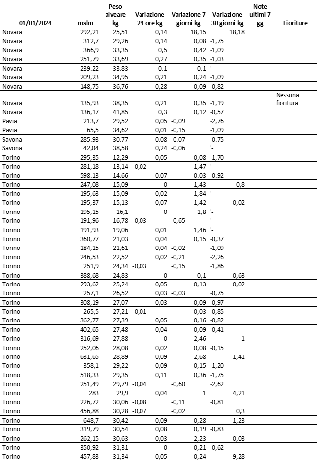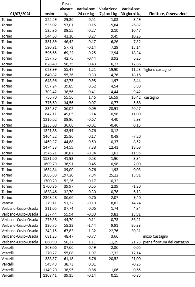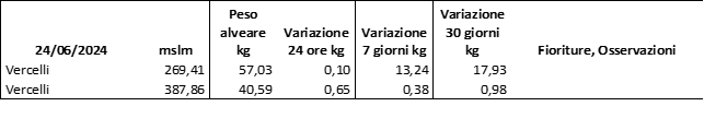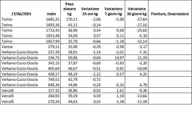 Di seguito le tabelle degli ultimi rilevamenti (dati fino al 15 luglio 2024; per consultare i dati successivi collegarsi al sito: (link non diretto, è necessario cliccare su “La bacheca dei bollettini” e poi su “Bollettino API”): https://www.regione.piemonte.it/web/temi/agricoltura/servizi-fitosanitari-pan
