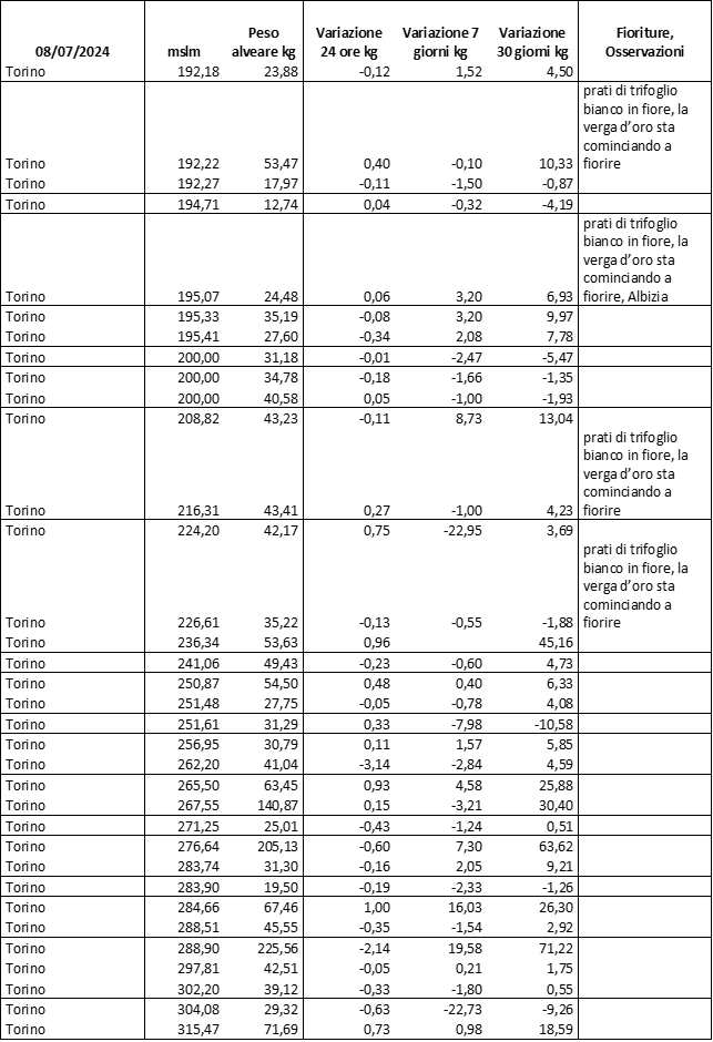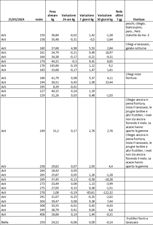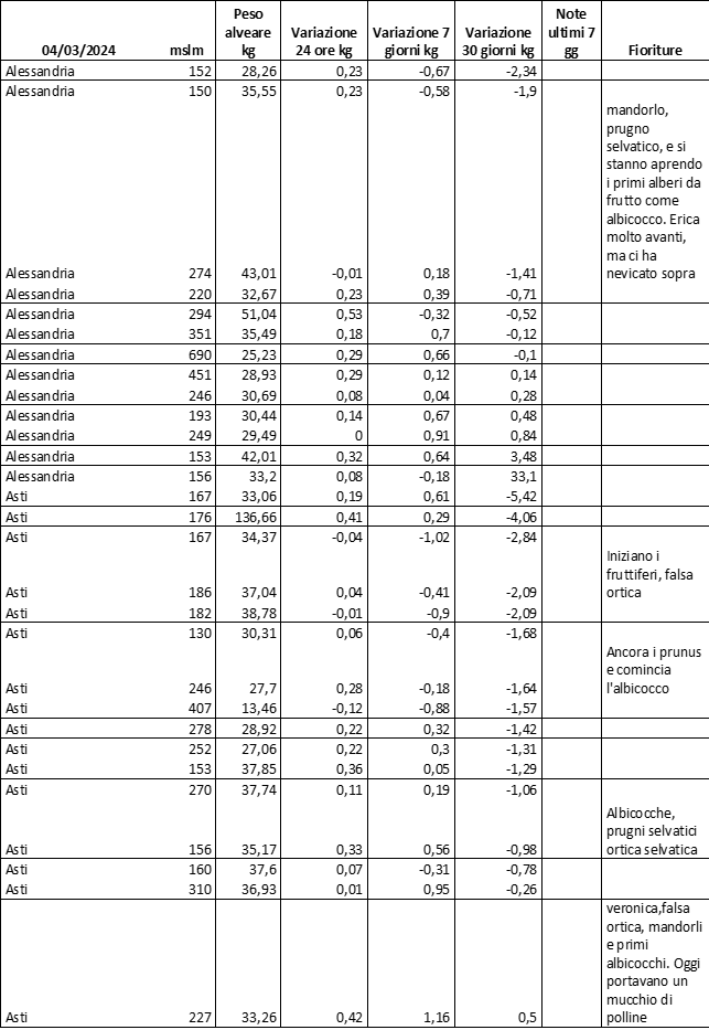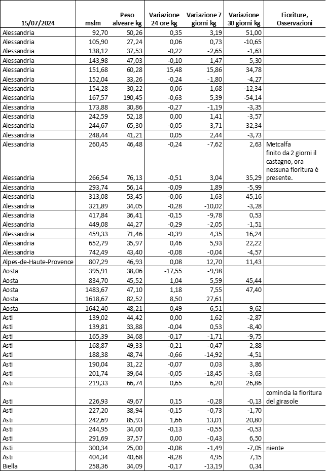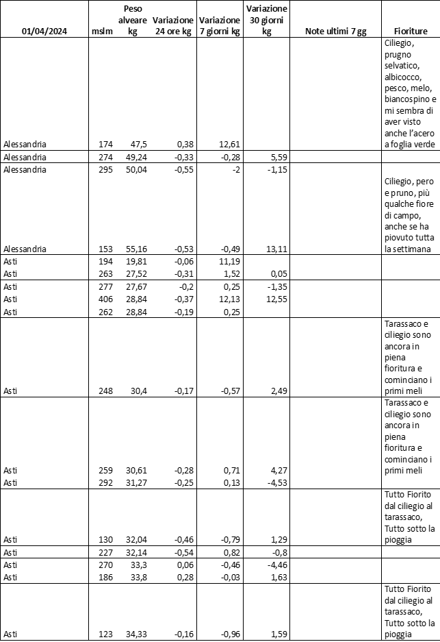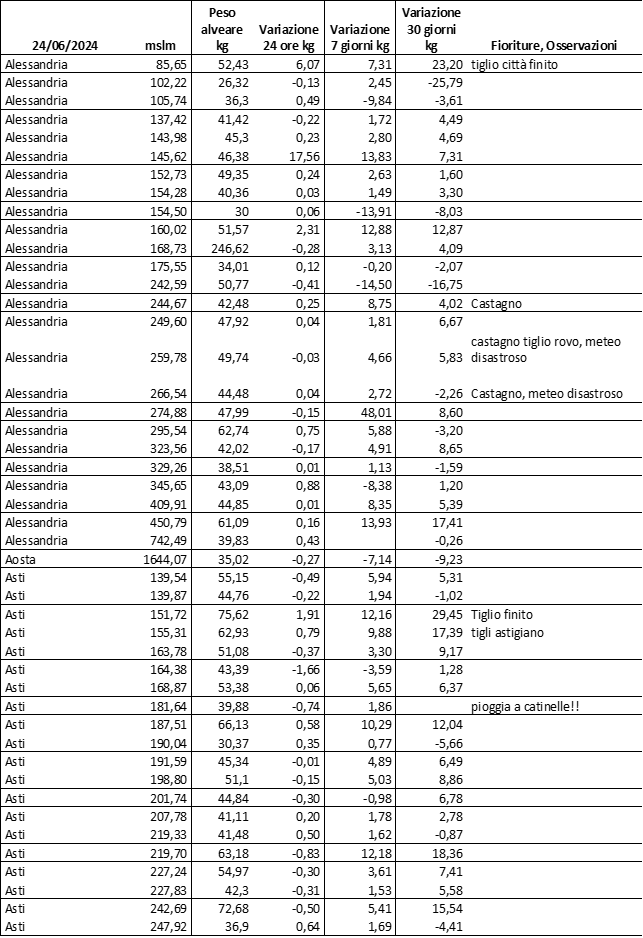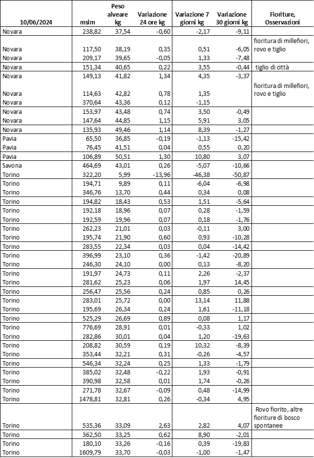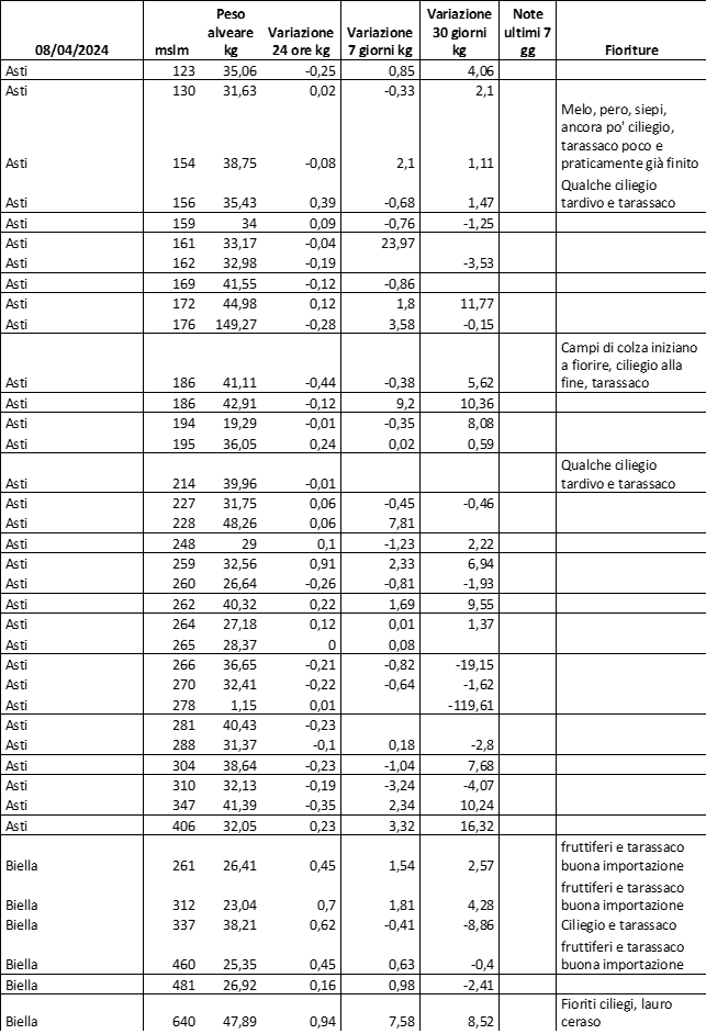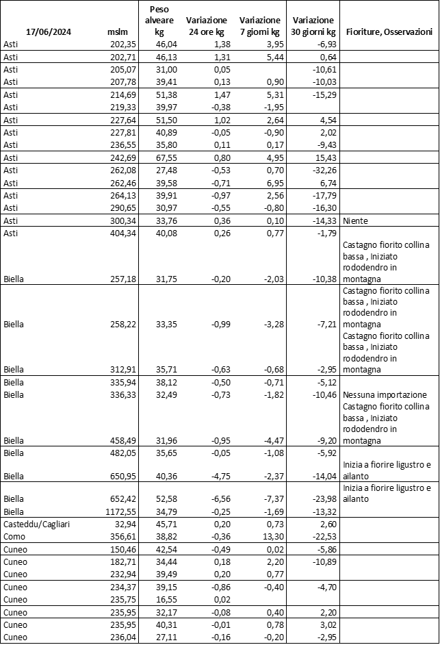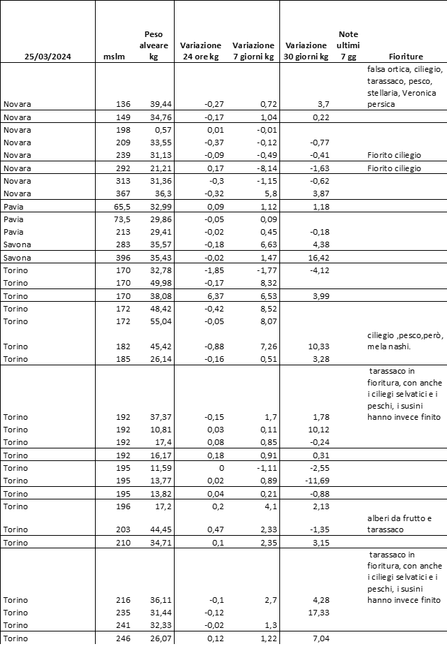 Di seguito le tabelle degli ultimi rilevamenti (dati fino al 15 luglio 2024; per consultare i dati successivi collegarsi al sito: (link non diretto, è necessario cliccare su “La bacheca dei bollettini” e poi su “Bollettino API”): https://www.regione.piemonte.it/web/temi/agricoltura/servizi-fitosanitari-pan